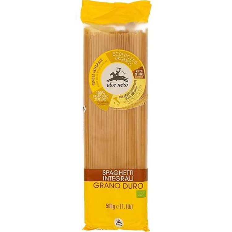 Alce Nero био пълнозърнести спагети от семолина се получават, като се използва само органичен пълнозърнест грис от твърда пшеница, получен чрез смилане на цялото зърно, без рафиниране или добавяне. Тестото за грис се прави с изворна вода от Доломитите. Alce Nero био пълнозърнести спагети от семолина са богати на фибри и са идеални в комбинация с доматени сосове или зеленчуци.