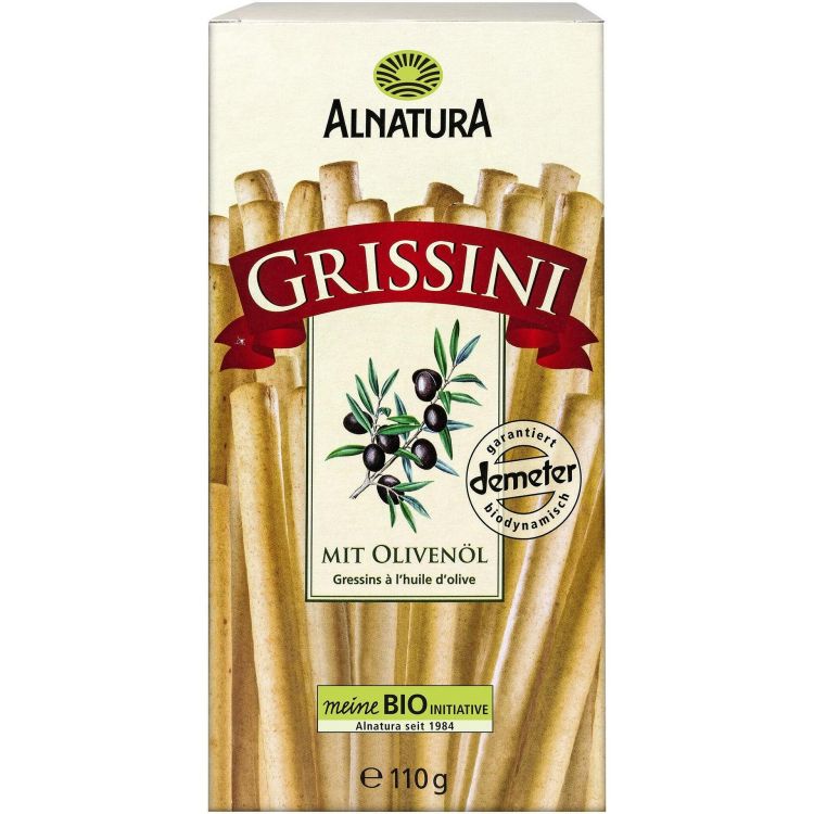 Био гризини в Demeter качество – тънки хрупкави хлебни пръчици, приготвени от пшенично брашно и обогатени с маслиново масло. Подправени с риган и пипер за фин средиземноморски вкус. Подходящи за поднасяне с дипове, вино и сирена или за директна консумация. Веган продукт.