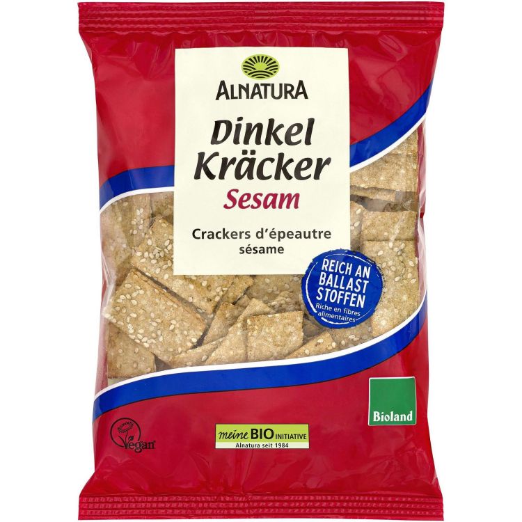 Хрупкави тънки био крекери, приготвени от 59% пълнозърнесто брашно от спелта (от Германия) и 39% ароматен сусам. Соевият сос придава фина солена нотка, а високото съдържание на фибри ги прави питателен и засищащ снакс. Подходящи за директна консумация или в комбинация със солени дипове. Произведени по Bioland стандарти. Продуктът е веган.