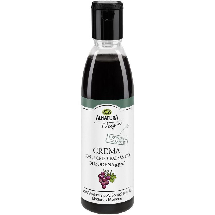 Типичен италиански балсамов крем, произведен от Acetum S.p.A. Società Benefit в Модена по традиционна рецепта. Приготвен от концентриран гроздов сок и балсамов оцет, сгъстен до лека, кремообразна консистенция с плътно, плодово-кисело ухание. Подходящ за подчертаване на вкуса на месни и зеленчукови ястия, сирена и десерти. Всички съставки са от биологично земеделие. Подходящ за вегани.
