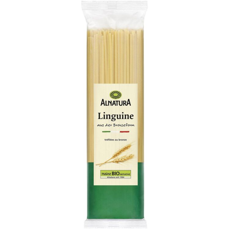 Описание: Лингуине са традиционни италиански дълги макаронени изделия, които са леко сплескани в сравнение със спагетите. Те произхождат от региона Кампания в Южна Италия и често се сервират с класическо песто или леки сосове. Alnatura лингуине са произведени в Италия по биологични стандарти от 100% италиански грис от твърда пшеница и са оформени с бронзови форми.