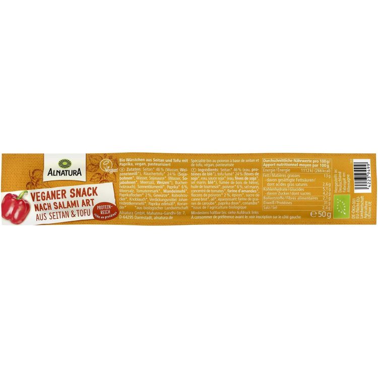 Био веган снакс по саламен тип, приготвен от тофу и сейтан (пшеничен белтък). Има наситен, пикантен вкус и високо съдържание на растителен протеин. Практичната опаковка го прави удобен за похапване в движение, на работа или по време на пътуване. Всички съставки са от контролирано биологично земеделие. Веган продукт.