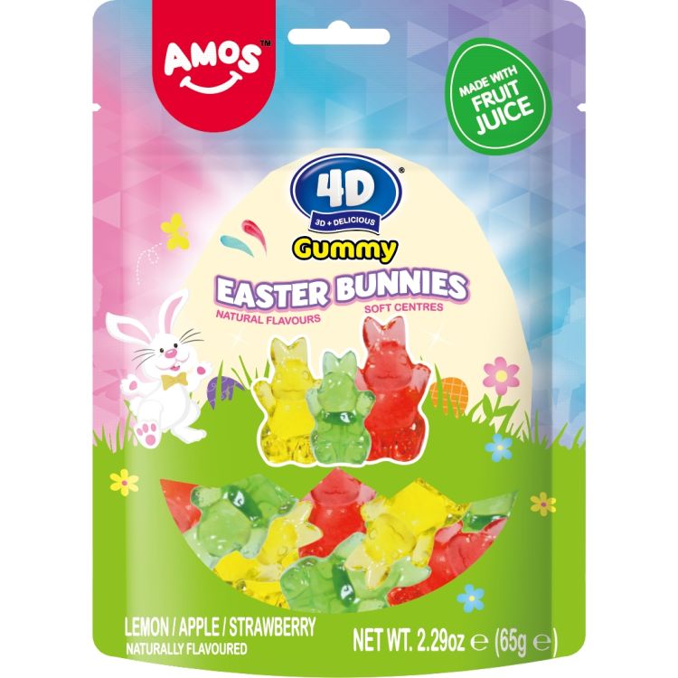 Amos 4D Gummy Mix Easter Friend and Easter Bunnies лимон, ябълка и ягода, 65 г