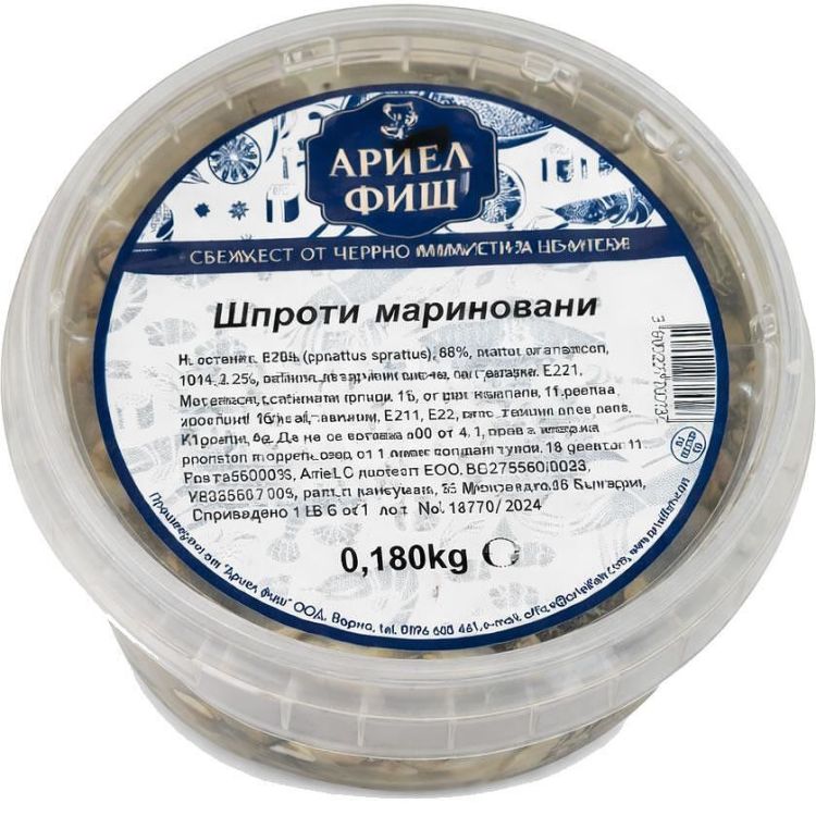 Мариновани шпроти, готови за консумация, произведени по традиционна технология. Подходящи за директна консумация или като добавка към салати и студени предястия.