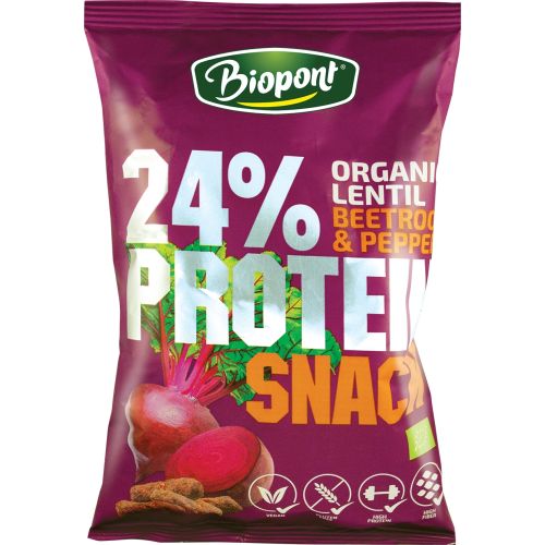 Био протеинов снакс на основата на леща с червено цвекло и черен пипер. Хрупкав и засищащ продукт с високо съдържание на протеин и фибри, подходящ за консумация между храненията, в офиса, в училище или след тренировка.