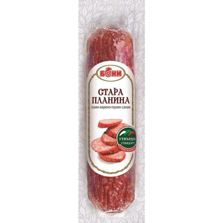 Траен варено-пушен салам „Стара планина“ с характерен вкусов профил, произведен от висококачествено свинско и говеждо месо. Подправките и технологията на пушене придават плътен аромат и традиционен вкус. Предлага се във вакуумна опаковка.