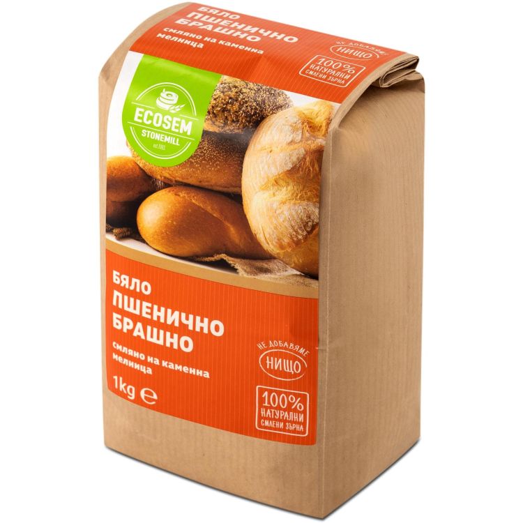 За да се получи бяло брашно с пухкава структура, се използва български сорт пшеница, отгледана в нивите на Екосем в Дунавската равнина. От тази пшеница се смила на каменна мелница пълнозърнесто брашно. От него се отсява с най-финото сито всички трици, а резултатът е бяло брашно с характерен леко кремав цвят.