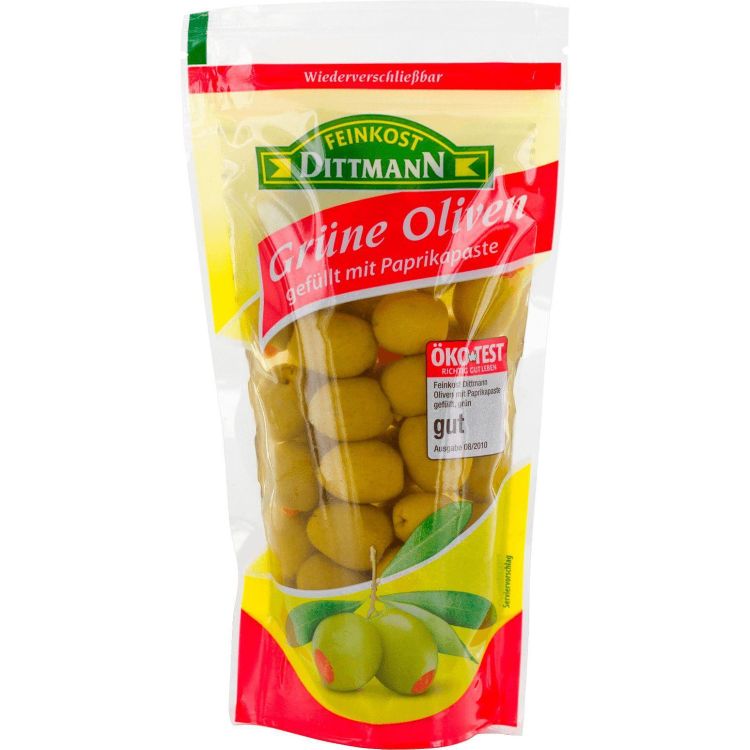 Feinkost Dittmann предлага висококачествени зелени маслини, пълнени с ароматна паста от червен пипер. Тези маслини са идеални за директна консумация, като част от антипасти, салати или като гарнитура към различни ястия.