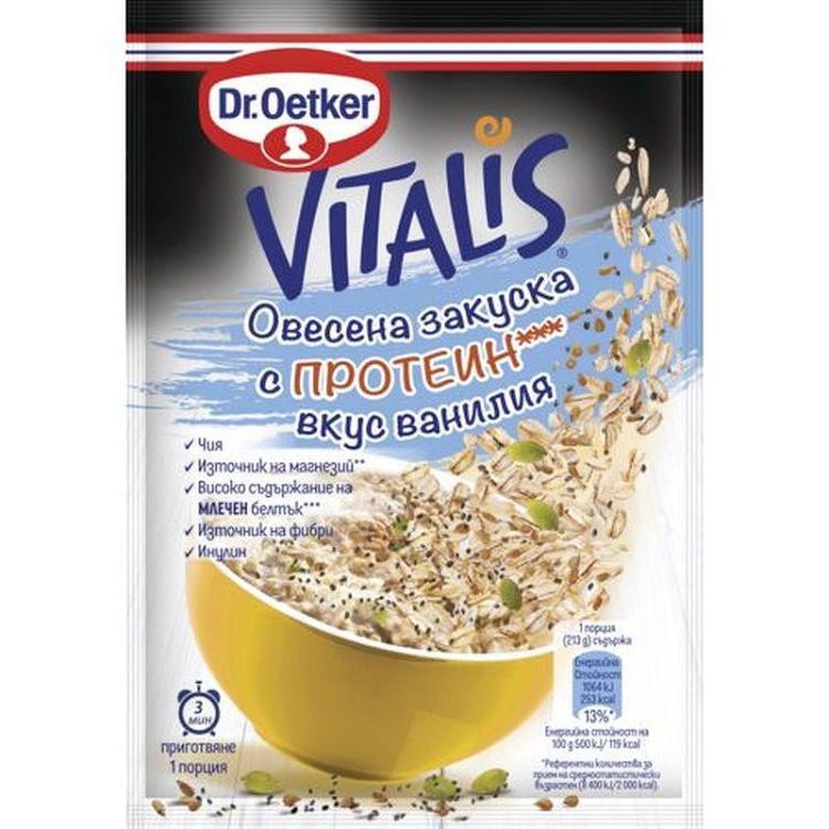 Vitalis овесена закуска Vitalis е лека и балансирана закуска с чия, пълнозърнести овесени ядки и семена. Богата на фибри, витамини и минерали. Добавените чия и магнезий подпомагат намаляването на умората и нормалния енергиен метаболизъм, а протеините – растежа на мускулната маса. Готова само за 3 минути с 150 мл гореща вода. Перфектна за бърз, свеж и енергичен старт на деня.
