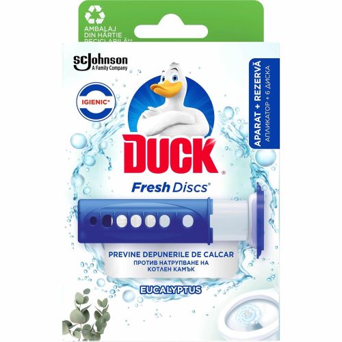 Свежите дискове DUCK действат като 5 в 1: предотвратяват натрупването на варовик, създават защитен слой, осигуряват дълготраен аромат, почистват при всяко пускане на водата и се използват хигиенично чрез директно дозиране в тоалетната чиния.