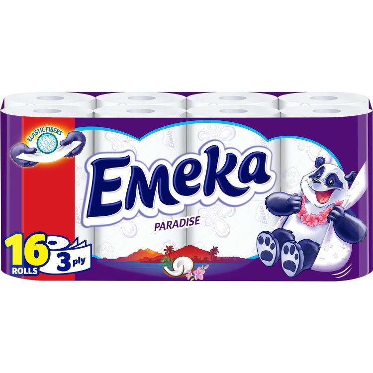 Emeka Paradise Strong Aroma Smart Toilet Paper е супер мека, трипластова тоалетна хартия с нежно тропическо ухание. Тоалетната хартия на Емека е супер здрава, което я прави икономична, а свежият аромат и меката на допир тестура позволяват използването ѝ дори и от хора с чувствителна кожа. Продуктът е изработен от 100% целулозен материал, съчетан с превъзходна мекота, искряща белота и цветни мотиви.