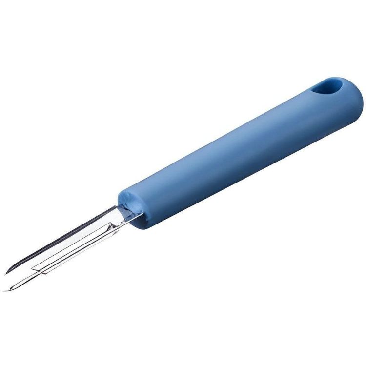 Белачка, Essential, острие: неръждаема стомана - 18/0 / AISI 430, дръжка: PP (тъмносин), 188 x 22 x 20 мм, 28 г, край на дръжката с практичен отвор за закачане, идеална за белене на тиквички, моркови, картофи и др., подходяща за съдомиялна машина