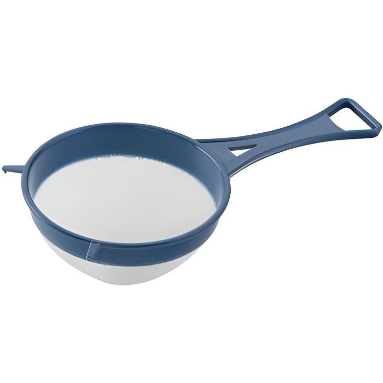 Цедка, Essential, Ø 12 см, мрежа: PE (прозрачно), дръжка: PP (тъмносин), рамка: PP (тъмносин), допълнение: PP, 224 x 118 x 65 мм, 20 г, край на дръжката с практичен отвор за закачане, ситна цедка за пресяване на пудра захар, брашно и др., подходяща за съдомиялна машина