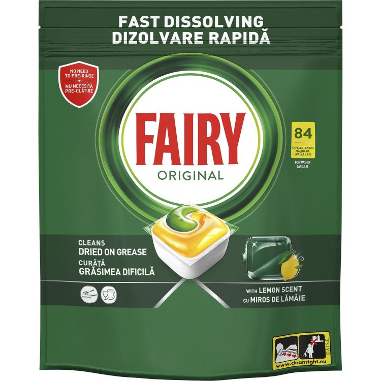 Fairy Original са таблетки за съдомиялна, които ефикасно премахват и най-упоритите замърсявания още след първото измиване. Таблетките дезинфекцират и защитават съдомиялните от натрупване на мръсотия и неприятни миризми.