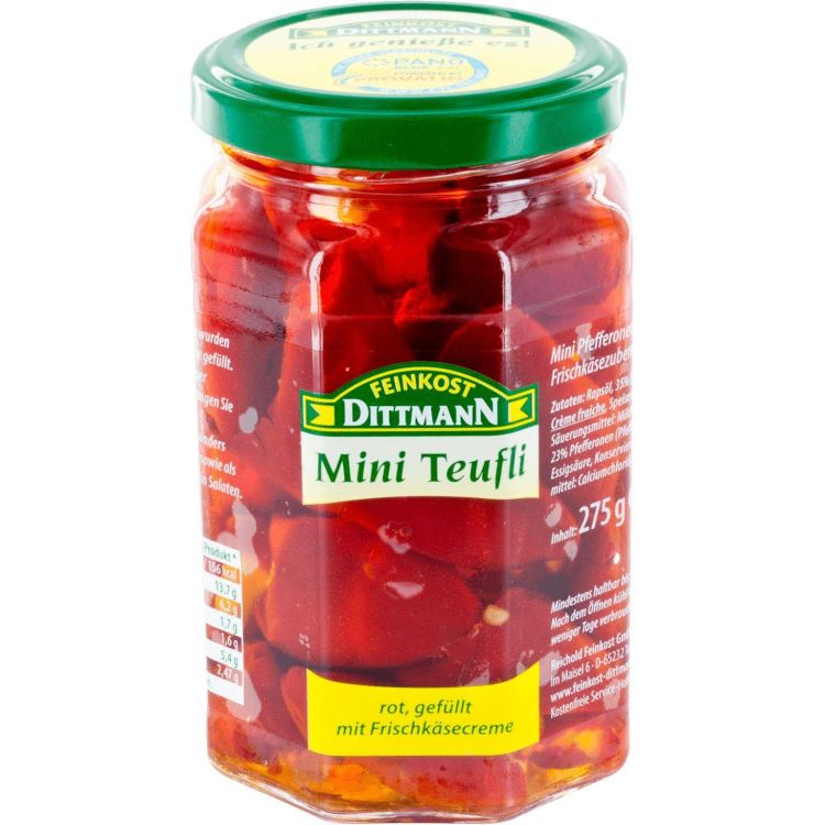 Feinkost Dittmann предлага ръчно пълнени мини червени пеперончини с кремообразна плънка от прясно сирене, идеални за директна консумация, като предястие или добавка към салати и други ястия.