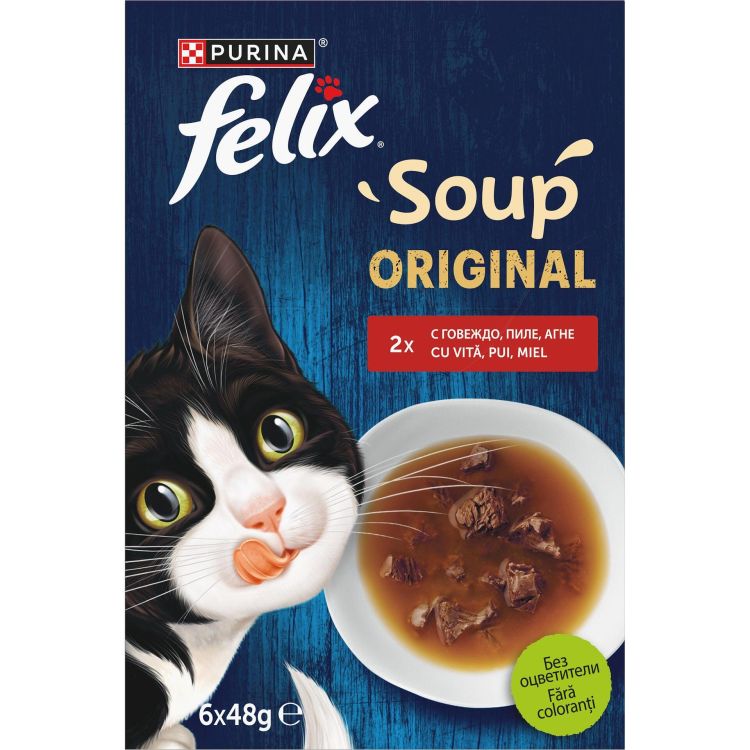 FELIX® Soup Original е вкусна допълваща храна за котки в зряла възраст – апетитна супа с крехки хапки, която е идеална за похапване по всяко време на деня. Подходяща като предястие преди хранене или като лека закуска между храненията.