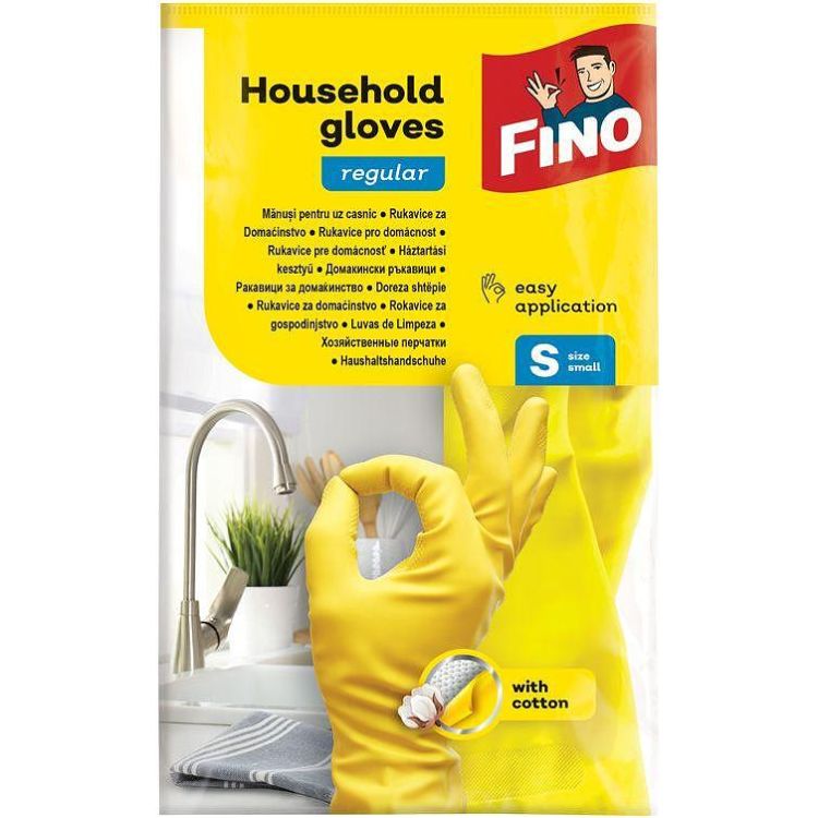 Fino Household Gloves S са домакински ръкавици, които ефикасно защитават кожата на ръцете при почистване на замърсени повърхности. Ръкавиците съдържат памук, който предпазва ръцете от изпотяване и осигурява добър хват, благодарение на релефната им повърхност.