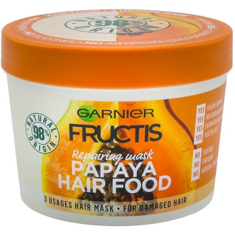 Garnier Fructis Repairing Papaya Hair Food е възстановяваща маска с папая, която подхранва, хидратира, омекотява и регенерира косата от корена до върха. Маската на Fructis е истинска храна за косата благодарение на вложените в състава 98% естествени съставки.