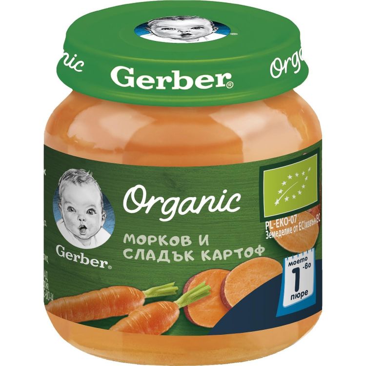 Gerber Organic Храна за бебета, Пюре от морков и сладък картоф, 125g, Моето 1-во пюре