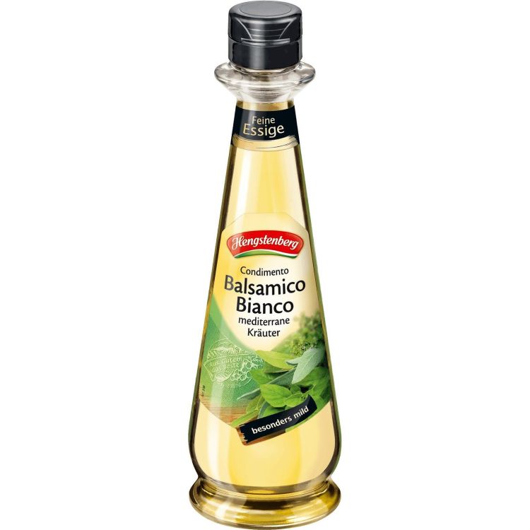 Оригиналният италиански Hengstenberg балсамиков оцет с подправки кондимиенто, направен от оцет от бяло вино и с висок процент концентрат на гроздов сок, е лек и мек. Неговият плътен, мек вкус придава на леките салати и сосове средиземноморски привкус.