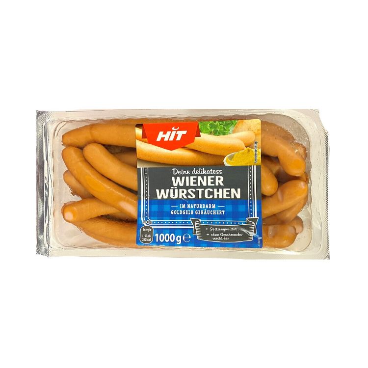 Деликатесни виенски кренвирши Wiener HIT, опаковани в защитна атмосфера. Произведени от висококачествено свинско месо, с класически вкус и фина текстура, подходящи за бързо приготвяне и разнообразни ястия.