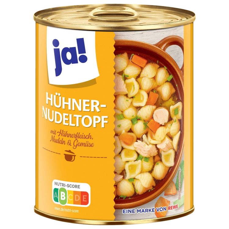 Съставки: вода, сварени нудели 28 % (вода, грис от твърда пшеница, яйчен белтък),8 % пилешко месо, моркови, праз, пилешка мазнина, сол, билки (вкл целина), захар, сгъстител: гума гуар, подправки (вкл. целина и синап), яйчен белтък, пшенично брашно, обезмаслено мляко на прах. Може да съдържа следи от соя. Условия на съхранение: Да се съхранява на сухо място. Партида L: виж маркировката;