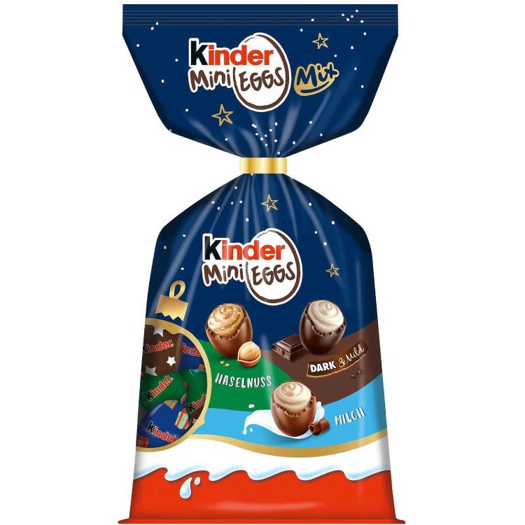 Kinder мини яйца с лешници и млечен пълнеж 49.5% и фини парченца лешници Съставки: млечен шоколад 45% (захар, пълномаслено мляко на прах, какаово масло, какаова маса, емулгатор: соев лецитин, ванилин), захар, обезмаслено мляко на прах 14.5%, палмова мазнина, лешници 6.5%, дехидратирани млечни мазнини, емулгатор: соев лецитин, ванилин. Съдържание на мляко в продукта 29.5%. Може да съдържат глутенсъдържащи житни култури, яйца, бадеми и шамфъстък.