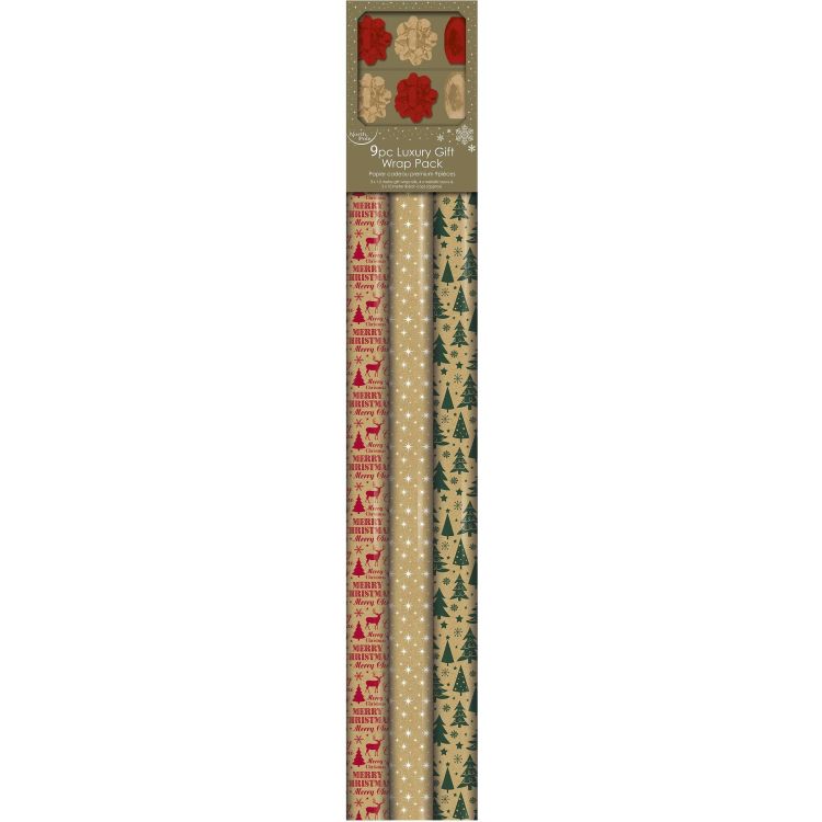 Коледен комплект за опаковане - три вида хартия и панделки (1 бр.)