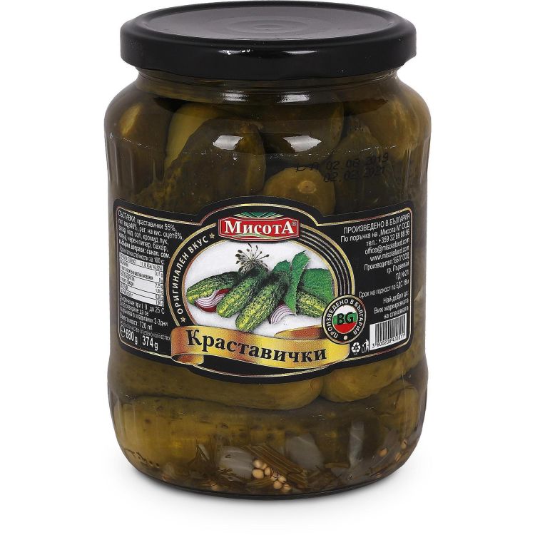 Съставки: краставички 55%, питейна вода 40%, регулатор на киселинността: оцет 6%, захар, йодирана сол, кромид лук, копър, черен пипер, бахар.