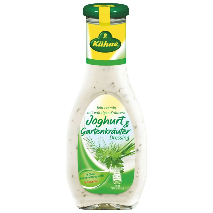 Състав: Вода, йогурт (30%), рапично масло, глюкозо-фруктозен сироп, оцет, билки (1,5%) (див лук, копър, магданоз), захар, сол, модифицирано нишесте, суроватъчен продукт, сгъстител ксантанова смола и пектин, концентрат от лимонов сок, подкислител Млечна киселина, естествен аромат, яйчен жълтък * * яйца от ферма