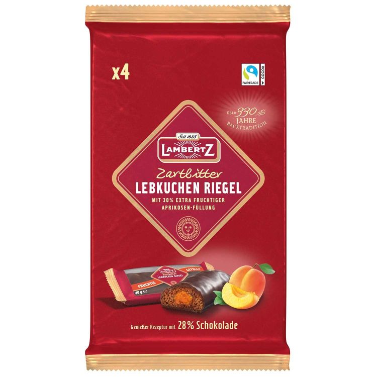 Съставки: глюкозо-фруктозен сироп, захар, пшенично брашно, пюре от кайсии, какаова маса, какаово масло, кисели-на: лимонена киселина, калиев цитрат, желиращ агент: пектин, набухвател: дифосфат, натриев и амониев карбонат, натурален ароматизант, подправки, влагозадържащ агент: сорбит, глицерин, слънчогледово олио, емулгатор: соев лецитин, фруктоза, сол. Може да съдържат следи от други черупчести плодове, фъстъци, яйца, мляко, лупина и сусам! Страна на произход: произведени в Аахен, Германия от Henry Lambertz GmbH