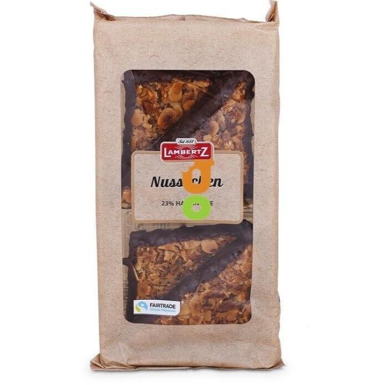 Съставки: лешници 23 % , пшенично брашно, захар, шоколад 12 % (захар, какаова маса, какаово масло, масло, емулгатор: соев лецитин), сироп от инвертна захар, влагозадържащ агент: сироп от сорбит, растителна мазни-на (палмова), фруктоза, яйчен прах, яйчен протеин, набухвател: натриев хидроген карбонат, естествени ароматизанти, сол. Може да съдържа следи от черупчести плодове и фъстъци. Условия за съхранение: сухо и хладно място Партида L: виж маркировката;