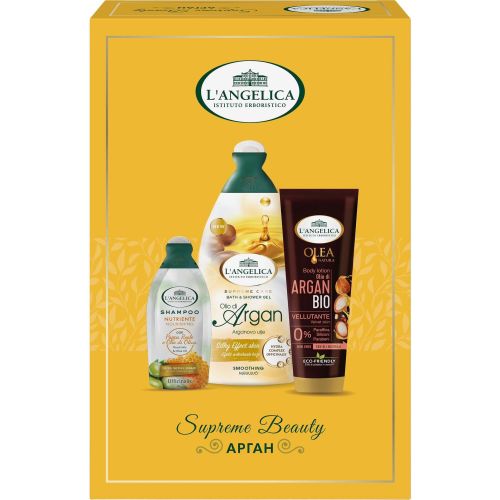 Комплектът включва: L'Angelica Officinalis душ-гел/пяна за вана с био масло от арган (500 мл), L'Angelica Olea Natura лосион за тяло с био масло от арган (250 мл) и L'Angelica Officinalis шампоан с пчелно млечице и масло от маслина (10 мл).