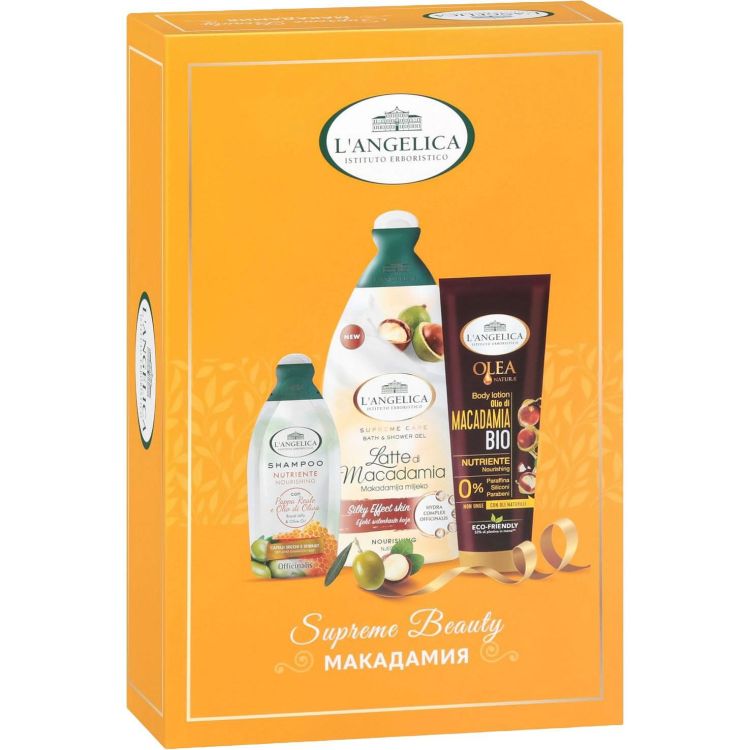 Комплектът включва: L'Angelica Officinalis душ-гел/пяна за вана макадамия (500 мл), L'Angelica Officinalis лосион за тяло макадамия (250 мл) и L'Angelica Officinalis шампоан с пчелно млечице и масло от маслина (10 мл).