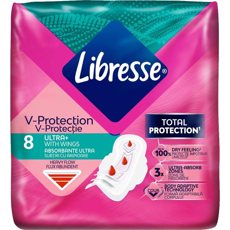 Libresse V-Protection Ultra Long+ дамски превръзки с крилца, 8 бр.