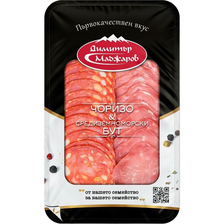 Комбинация от два деликатеса – ароматно чоризо и средиземноморски бут Маджаров. Перфектно предложение за гурме плата и леки мезета. Опаковано в защитна газова среда за запазване на вкуса и свежестта.