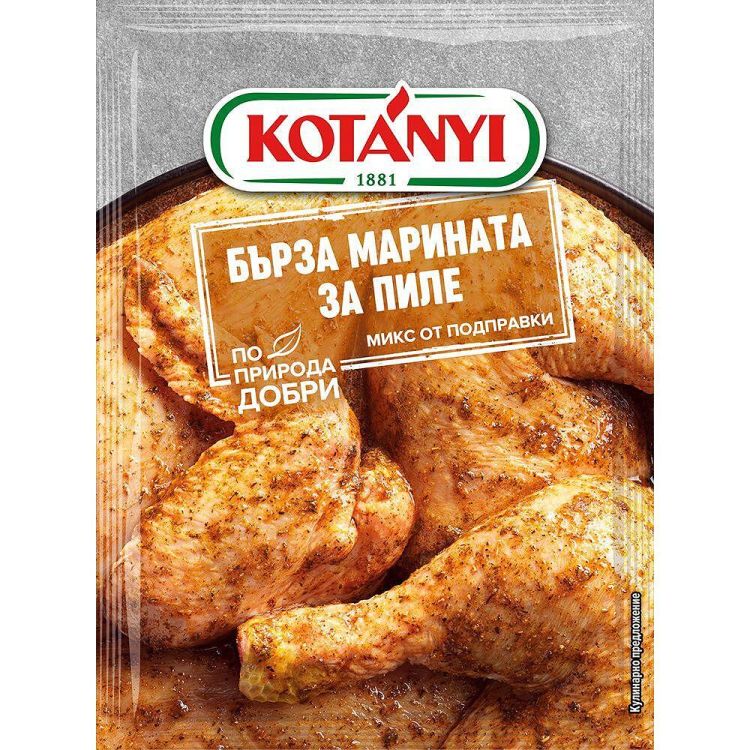 Със специалната Бърза Марината КОТАНИ пилешкото месо става изключително крехко и сочно. Много е лесно - просто добавяте малко олио в сместа и мариновате месото най-много 25 минути. За перфектен вкус - напълно натурален продукт, без овкусители и консерванти