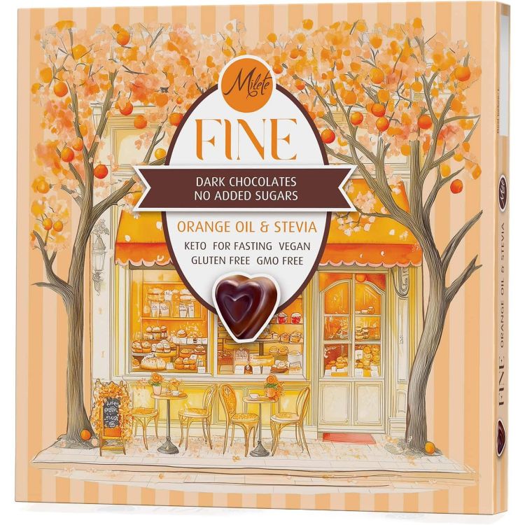 Milete Fine шоколадови бонбони с черен шоколад, еритритол, стевия и портокалово масло, без глутен, без захар (80 г)