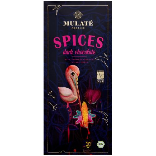 Био черен шоколад с цейлонска канела, ванилия и кайенски пипер. Съдържа 70% какаова маса. Вкусът се променя постепенно при разтапяне, разкривайки балансирана комбинация от сладко, пикантно и ароматно. Подходящ за вегани и без глутен.