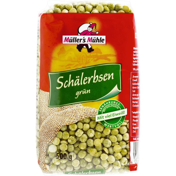 Müller's Mühle зелен грах, при който кората е отстранена чрез процес на белене.