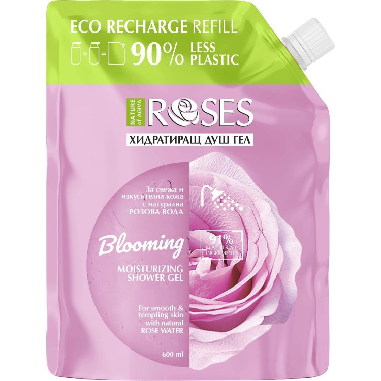 Описание: Натурална формула с богата пяна и деликатно измиващо действие, с 91% натурален състав за копринено гладка и нежна кожа. С неустоим цветен аромат. Пълнителят е предназначен за презареждане на два броя бутилки ROSES хидратиращ душ гел от 300 мл. Екологично съобразена опаковка, която спестява до 90% пластмаса в сравнение с традиционната бутилка. Избягвайте контакт с очите.