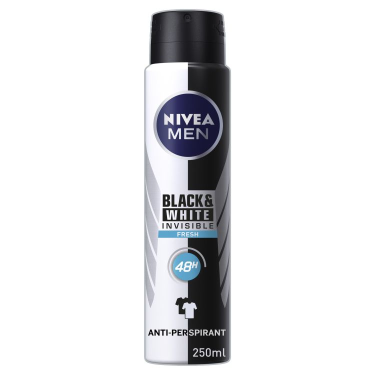 Дезодорант NIVEA MEN BLACK & WHITE INVISIBLE осигурява 48 часова защита от изпотяване, която не оставя бели следи по черните дрехи и намаля риска от жълти петна по светлите дрехи. Черното остава черно, а бялото бяло по-дълго. Прозрачната формула не оставя следи по кожата и осигурява дълготраен свеж и чист аромат.