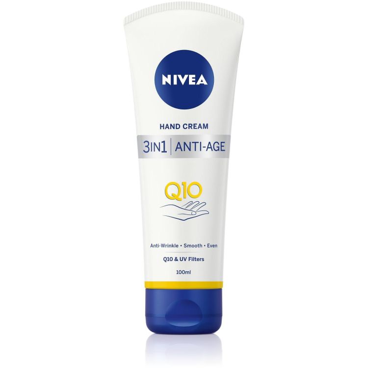 Nivea 3in1 Anti-Age Q10 Hand Cream е специално разработен крем за ръце с Q10, който предотвратява първите белези на стареене и интензивно хидратира кожата на ръцете в дълбочина, като я прави мека и гладка. Иновативната му формула е обогатена с Q10, който поддържа естествената структура на кожата и я оставя мека и еластична. Уникалната текстура на крема се абсорбира бързо от кожата и не оставя мазен филм. След употребата на продукта на Нивеa кожата е овлажнена, копринено мека и гладка, а първите белези на стареене са заличени.