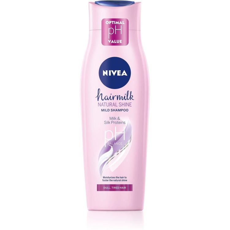 NIVEA® Hairmilk Natural Shine Подхранващ шампоан интензивно хидратира безжизнената, уморена коса, за да я направи отново видимо по-здрава и да разкрие естествения блясък. Формулата е с естествено извлечени млечни и копринени протеини: Възстановява косата отвътре за хидратирана и видимо здрава коса. Изглажда косата, за да подреди всеки косъм в перфектна хармония. За идеално здрава и копринено мека коса.