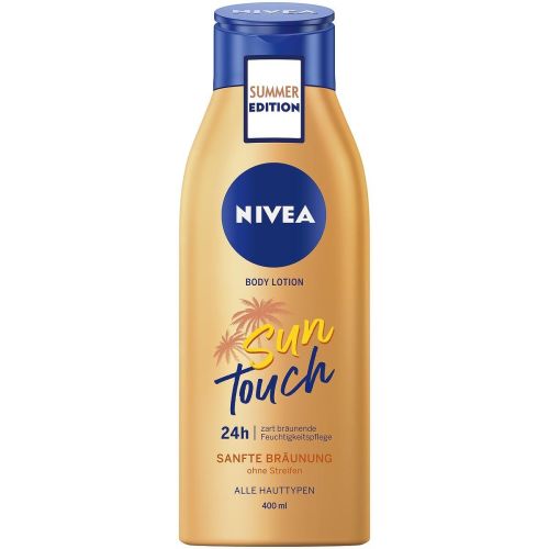 NIVEA Лосион за тяло Sun Touch придава на кожата нежен и естествен тен без да оставя петна по дрехите. Формулата е обогатена с екстракт от гинко и масло от гроздово семе. Видимо омекотява кожата и я хидратира в продължение на 24 часа. С неустоим летен аромат. Предназначен е за светла до средно тъмна кожа. Дерматологично доказана съвместимост с кожата. Продуктът съдържа внимателно подбрани съставки от най-високо качество.