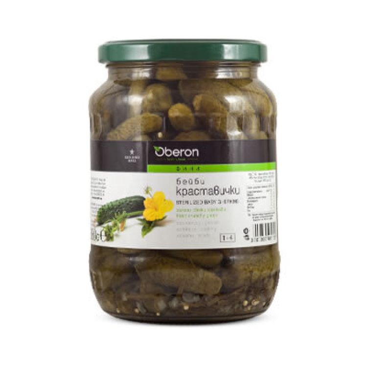 Състав: Корнишони, вода, сол, регулатор на киселинността: оцетна киселина, захар, черен пипер, бахар, синап, чесън, копърово масло.