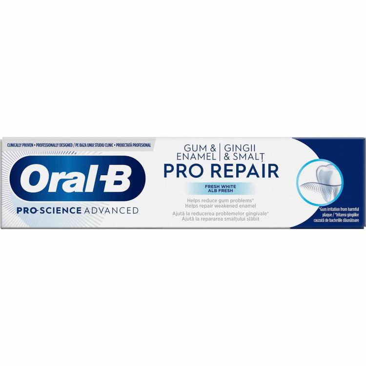 Помага за възстановяване на емайла и предпазва зъбите от киселинна ерозия. Неутрализира плаката, съдържа флуорид за защита от кариеси и освежава дъха. Пастата за зъби Oral-B Pro Repair Fresh White спомага за намаляване на проблемите с венците и укрепва отслабения емайл чрез специална технология, насочена към областта на венците. Има приятен вкус и създава усещане за дълготрайна свежест.