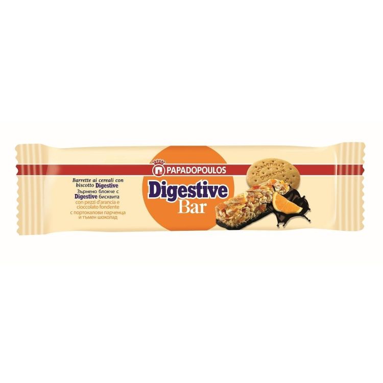 Papadopoulos Digestive зърнено блокче с бисквита с парченца портокал и млечен шоколад, без добавена захар (28 г)