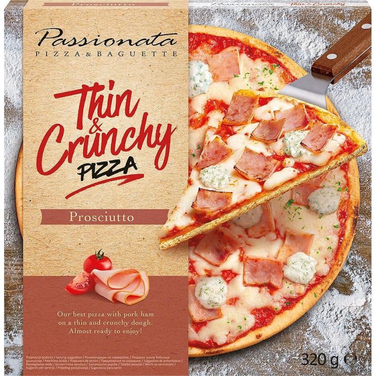 Passionata пица прошуто. Пица, покрита със свинска шунка, върху предварително изпечено тесто.