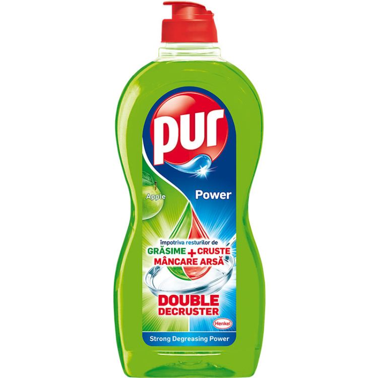 Pur Power е мощен продукт в категорията препарати за миене на съдове, който съумява да донесе облекчение от тежките проблеми при миенето на съдове, като мазни петна, загоряла и засъхнала храна. Pur Power Apple има плодов и свеж аромат, който ви напомня за зелените поляни и ябълковите дървета в края на лятото.